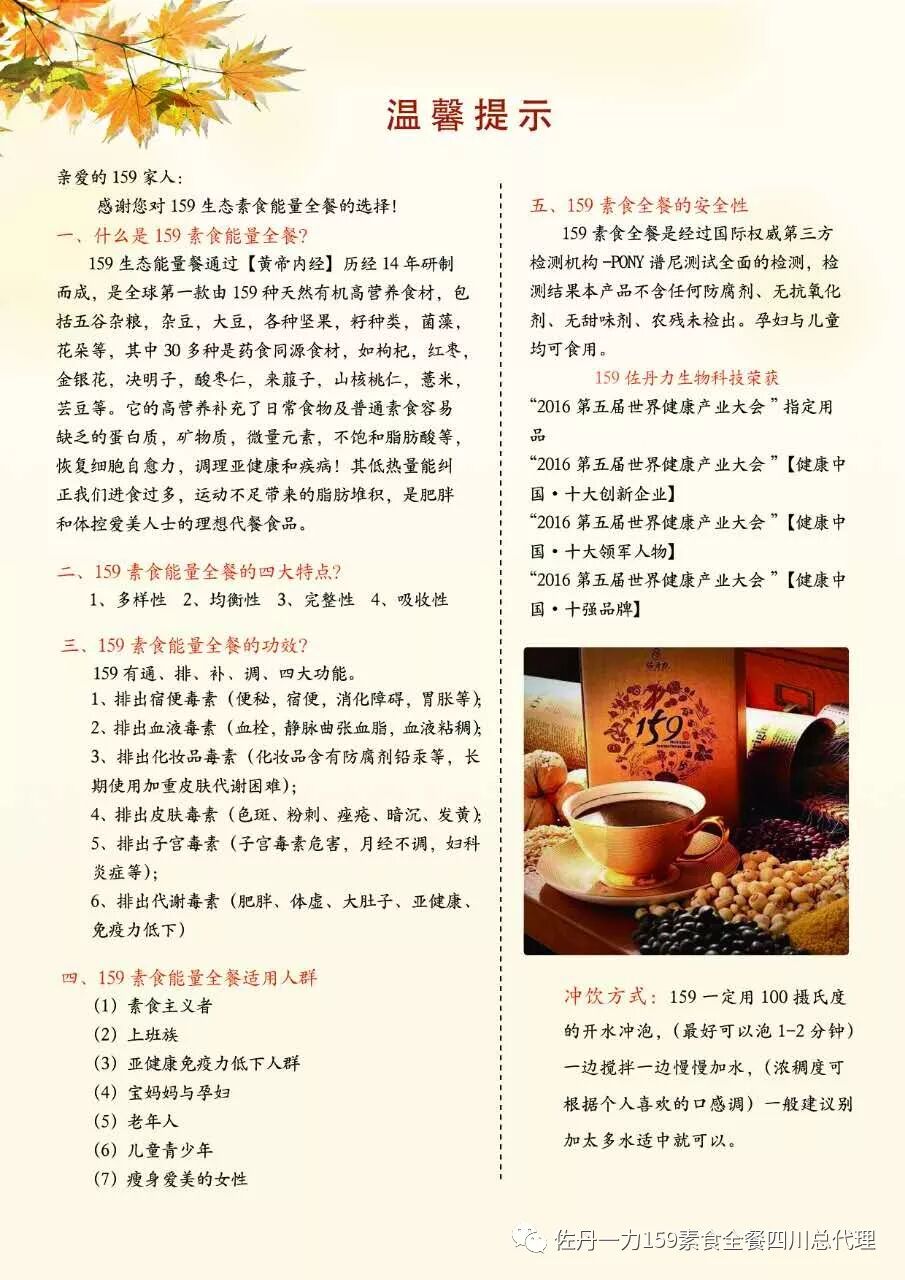 159不是药,也不是保健品,159是功能性食品,通排补全面营养,启动人体自身治愈力。159原生态能量餐是全球第一款159种天然有机高营养食材,以五行相生、全粒入餐为原则,甄选坚果、种籽、花朵、谷豆、菌藻等159种纯植物食材,按营养学标准针对适用人群精准计算食材比例配置,包括五谷杂粮,杂豆,大豆,各种坚果,籽种类,菌藻,花朵等,其中30多种是药食同源食材,如枸杞,红枣,金银花,决明子,酸枣仁,来菔子,山核桃仁,薏米,芸豆等,完美诠释了“食材多样化”概念。它的高营养补充了日常食物及普通素食容易缺乏的蛋白质,矿物质,微量元素,不饱和脂肪酸等,纠正了平常吃多了,吃错了,吃亏了,细胞不健康状况,恢复细胞自愈力,调理亚健康和疾病!